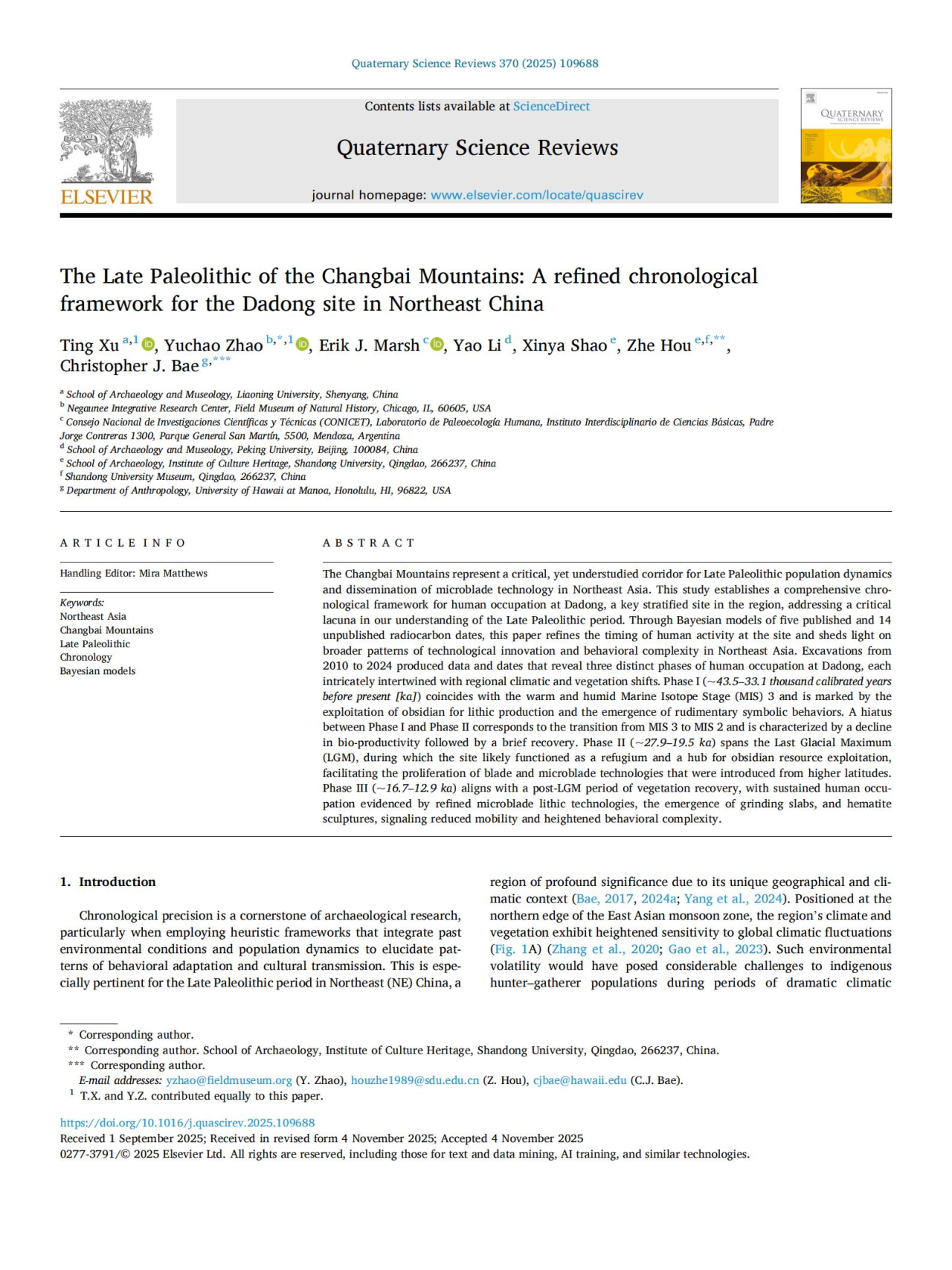 11月8日,历史学部考古文博学院教授徐廷作为第一作者合作完成的论文“The Late Paleolithic of the Changbai Mountains: A refined chronological framework for the Dadong site in Northeast China”在国际知名学术期刊Quaternary Science Reviews(中国科学院二区 Top,校A-)在线发表。本研究受国家社科基金(23AKG001)及国家文物局”考古中国“重大项目资助。