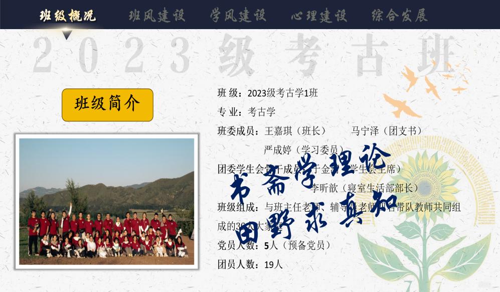 荣誉加身,责任在肩。2023级考古班将以此次获评“标兵班级”为新的起点,继续怀揣着对考古事业的赤诚热爱,深耕考古专业学习与实践,把班级建设与学科发展、文化传承紧密结合,步履不停,行稳致远。